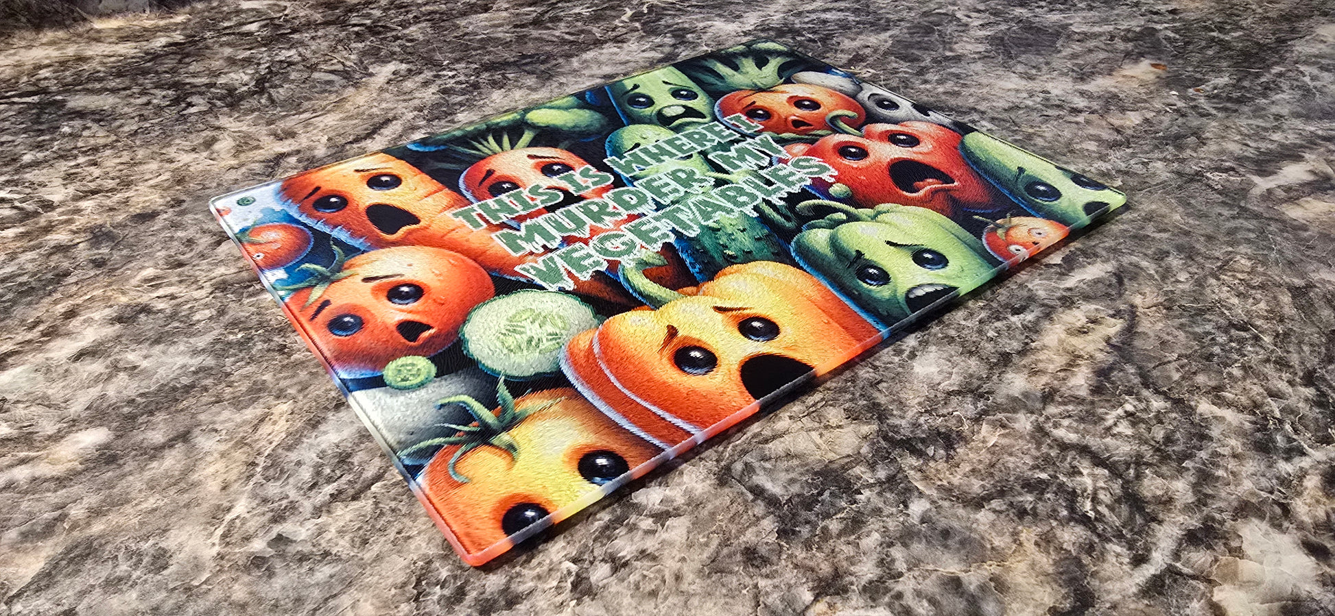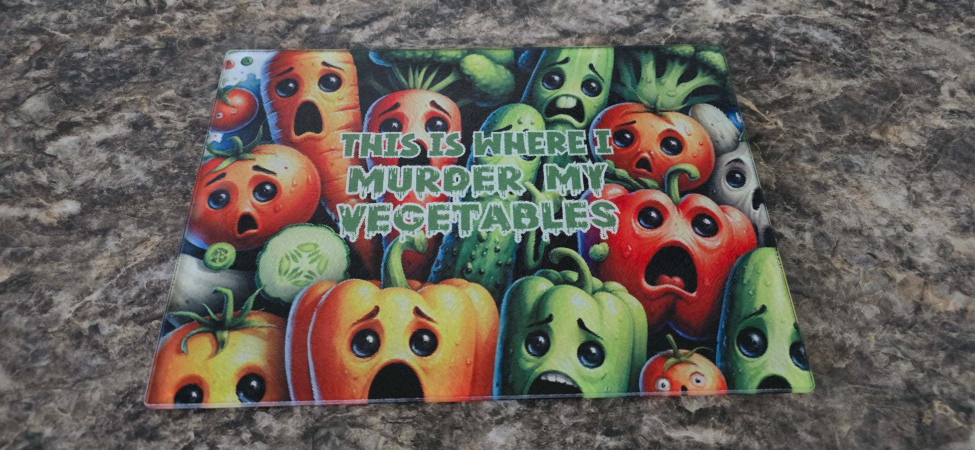 POV: Your veggies are screaming for mercy 😱🍅🥒. This hilarious cutting board is giving all the chef vibes with a dark twist! Perfect for your next kitchen TikTok. Tag a friend who would totally love this!